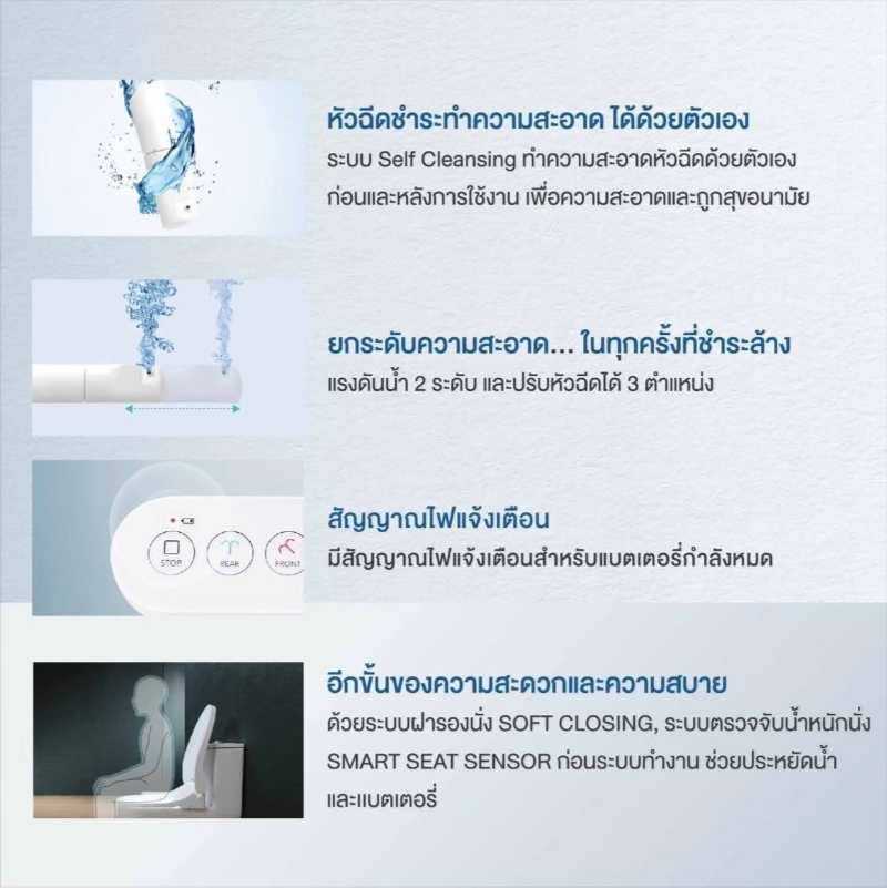 ด้วยระบบฝารองนั่ง Soft Closing ระบบตรวจจับน้ําหนักนั่ง (Smart Seat Sensor) ก่อนระบบ ทํางาน ช่วยประหยัดน้ําและแบตเตอรี่